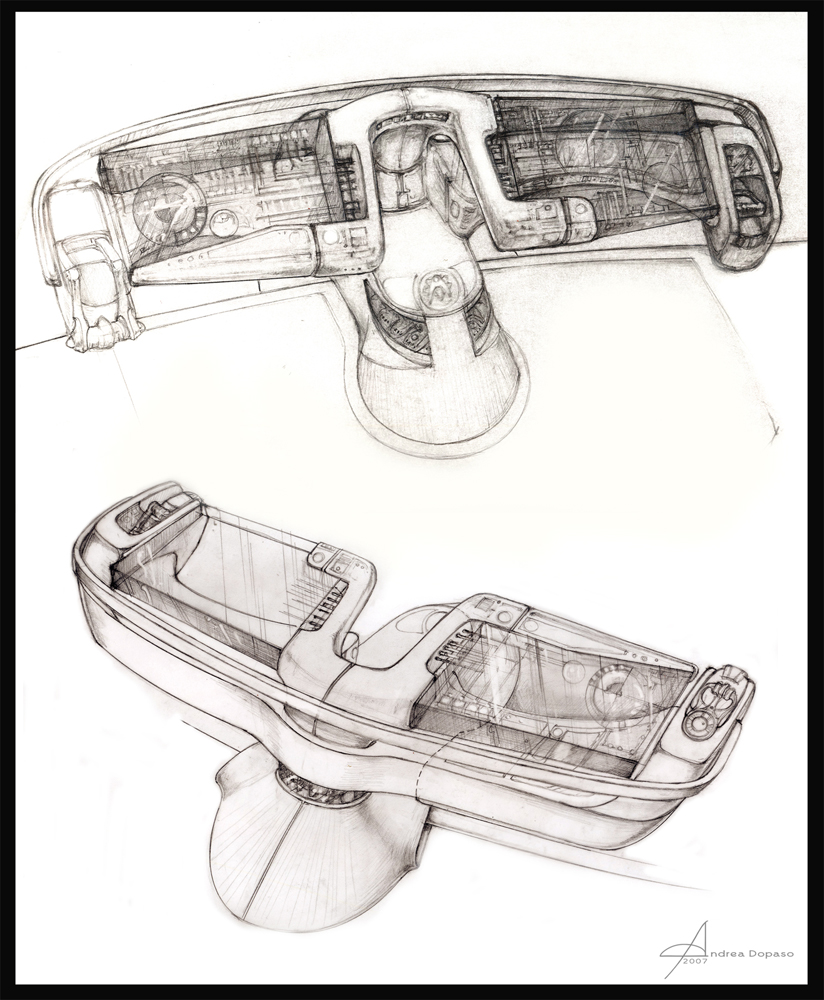 We were all trying different options and inspirations, I started by sketching simple console designs in pencil using as a reference an old car bumper, the idea evoked an old/modern feel, and lucky me one of them was the ticket!. J.J. love it and I was thrilled. Then the same look spread to the other consoles, buttresses and hub, and the whole interior.